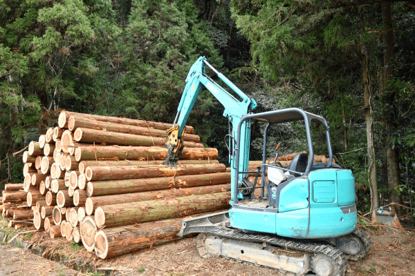 伐採(収穫)した丸太は、ケーブルなどで吊るして山から林道まで運び出されたり、ウインチで引っ張ったりして搬出されます。
